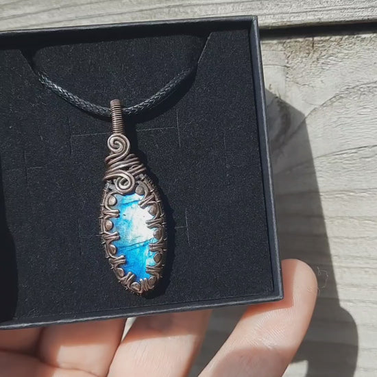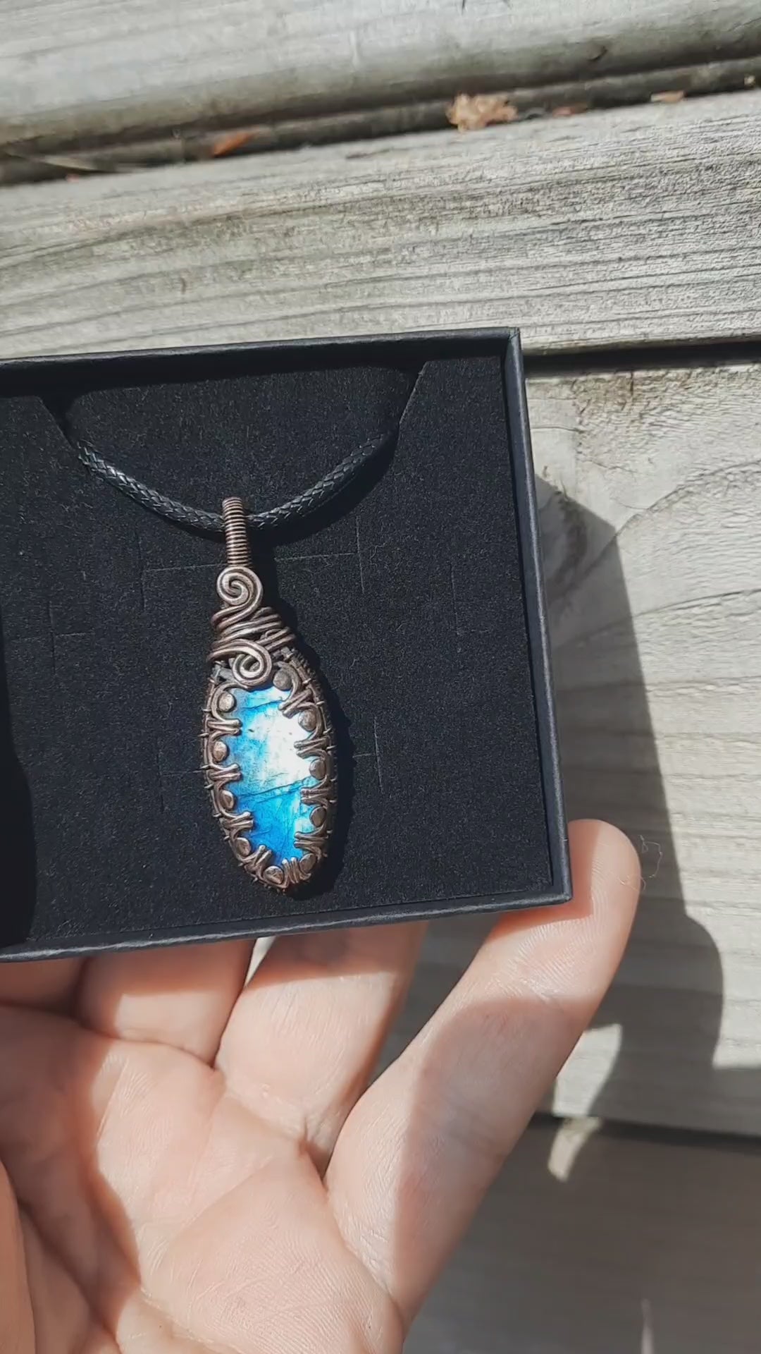 Unveil your inner magic with this one-of-a-kind labradorite pendant, handcrafted with warm copper wire in a detailed gallery-style wrap. The natural labradorite stone shimmers with flashes of electric blue—believed to awaken spiritual insight and protect your energy.