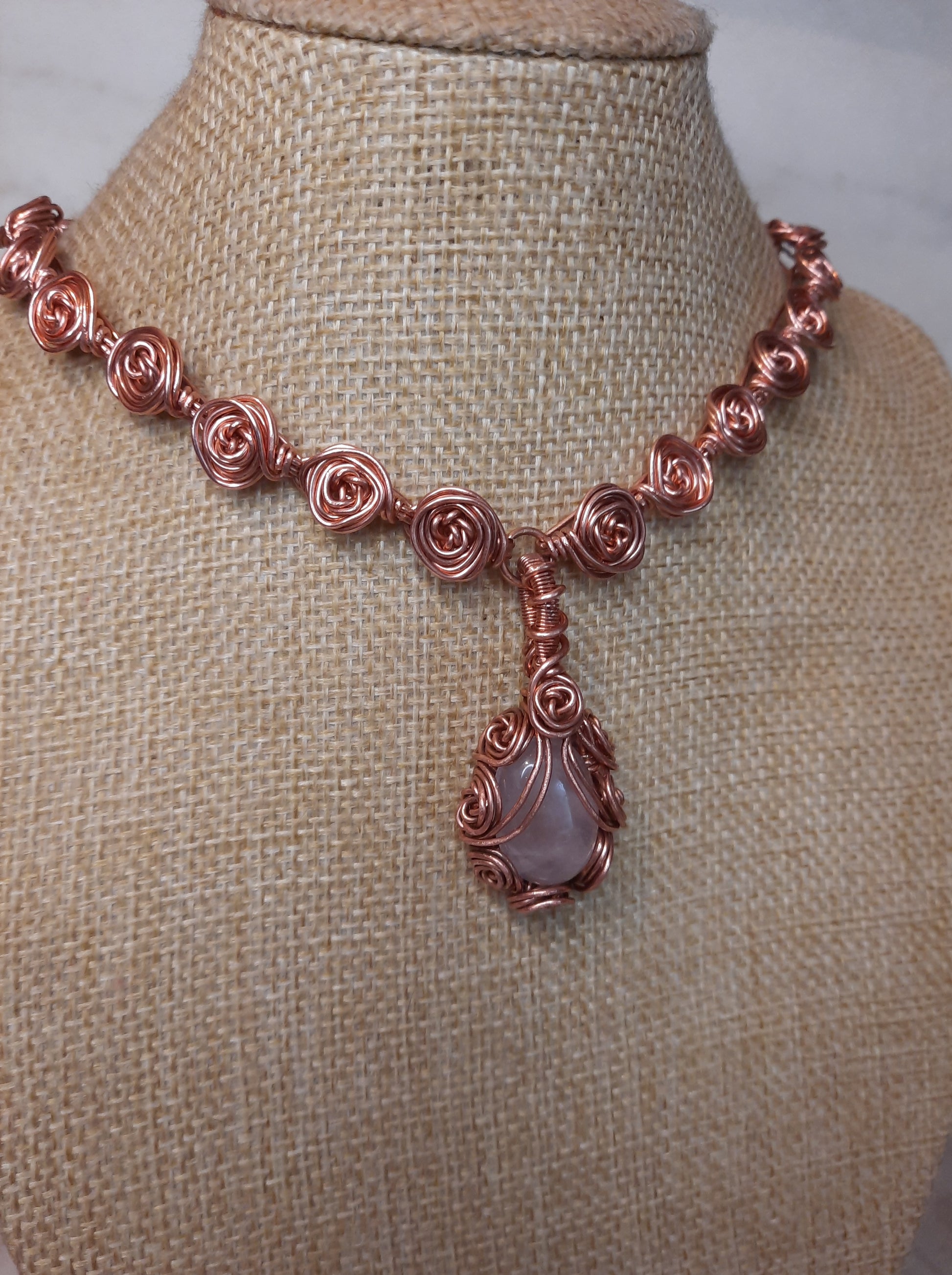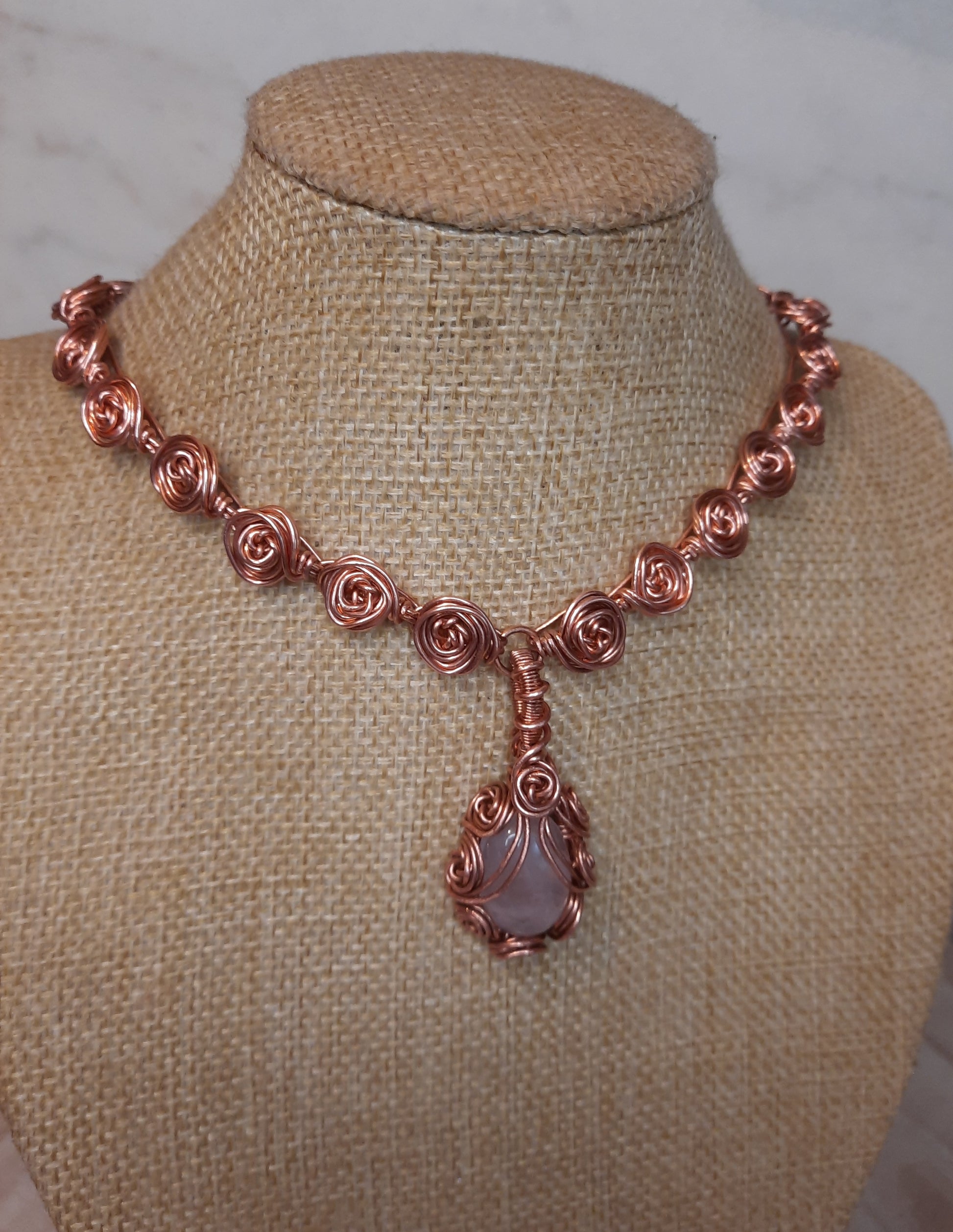 Embrace the gentle energy of love with this handcrafted rose quartz necklace, wrapped in warm copper tones and adorned with a chain of individually formed roses. Each delicate link is crafted by hand, allowing for beautiful movement and comfort when worn.
