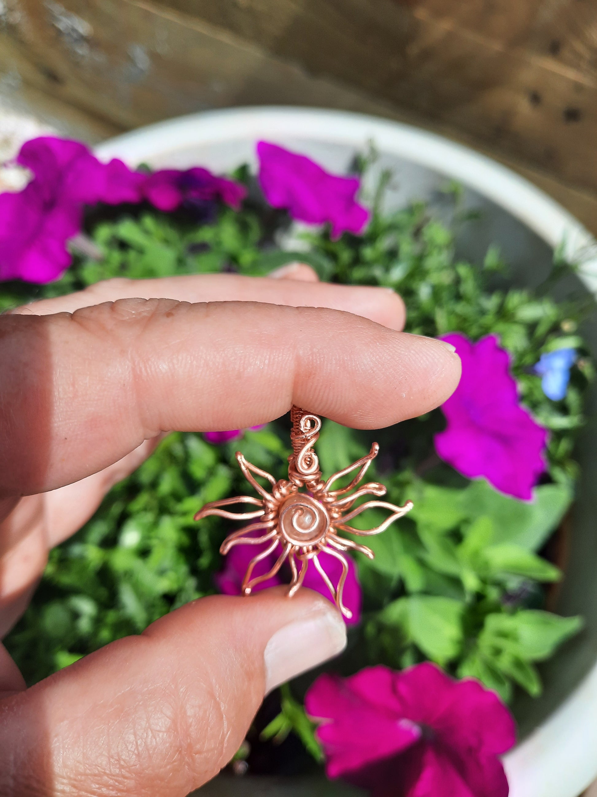 This whimsical pendant captures the warmth and vitality of the sun, hand-wrapped with care using copper wire and a beautiful sunstone bead at its heart. The fiery spiral core echoes the life-giving energy of the sun, making this a perfect piece for those drawn to bold radiance and grounding energy.